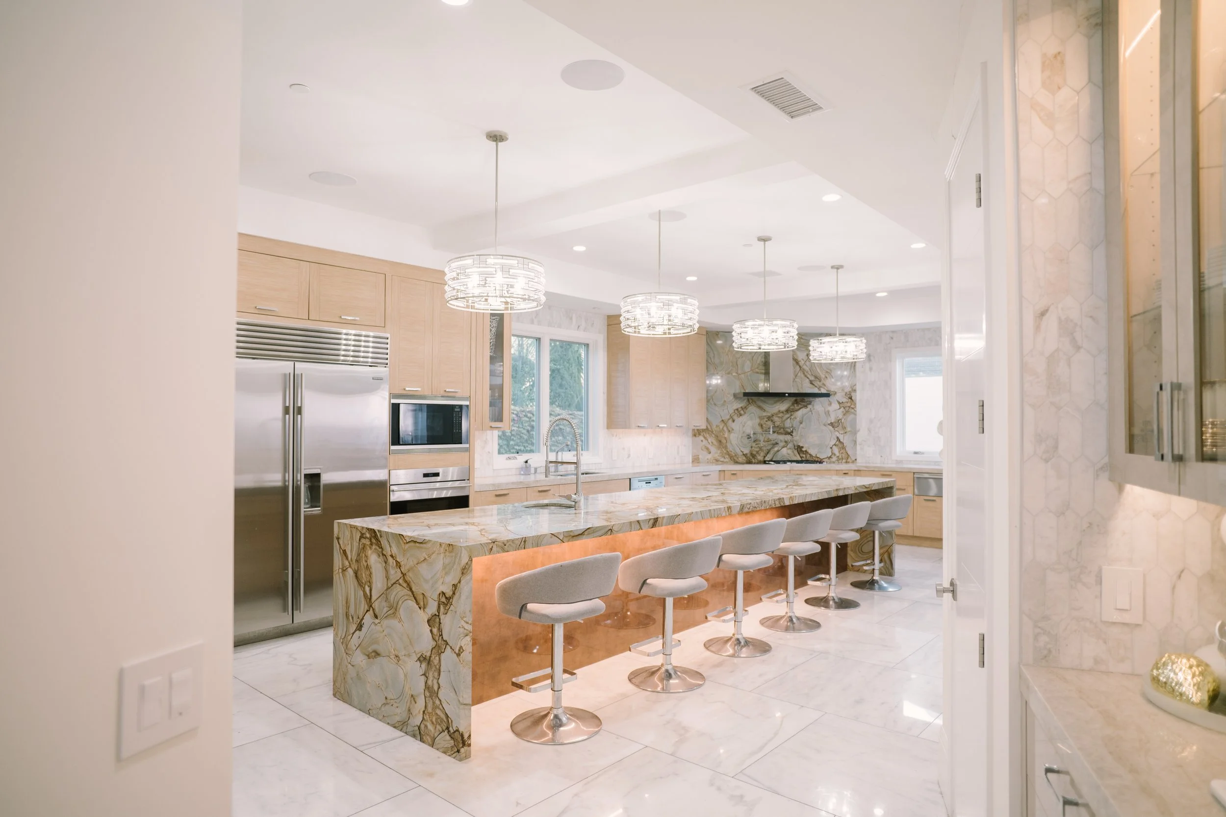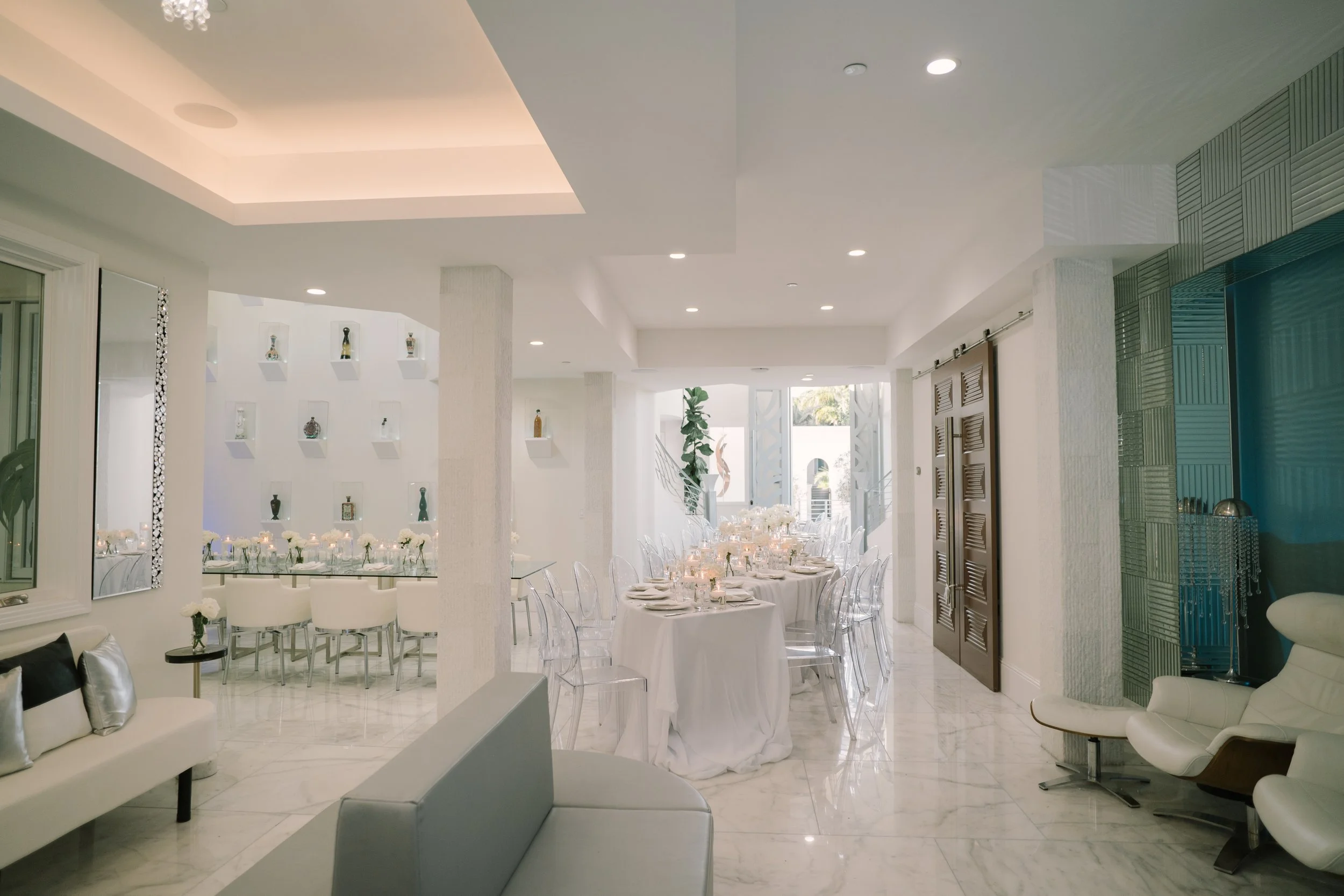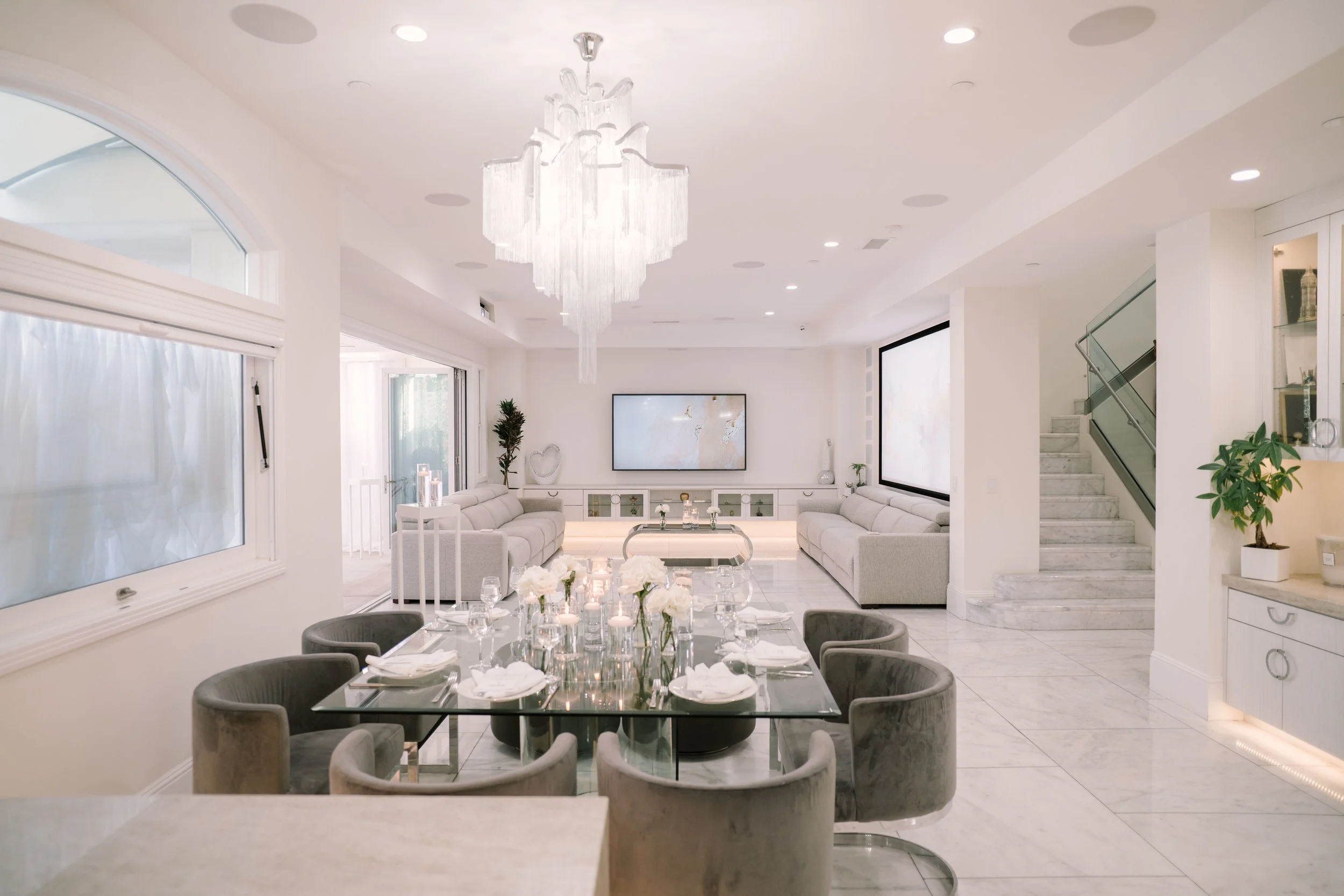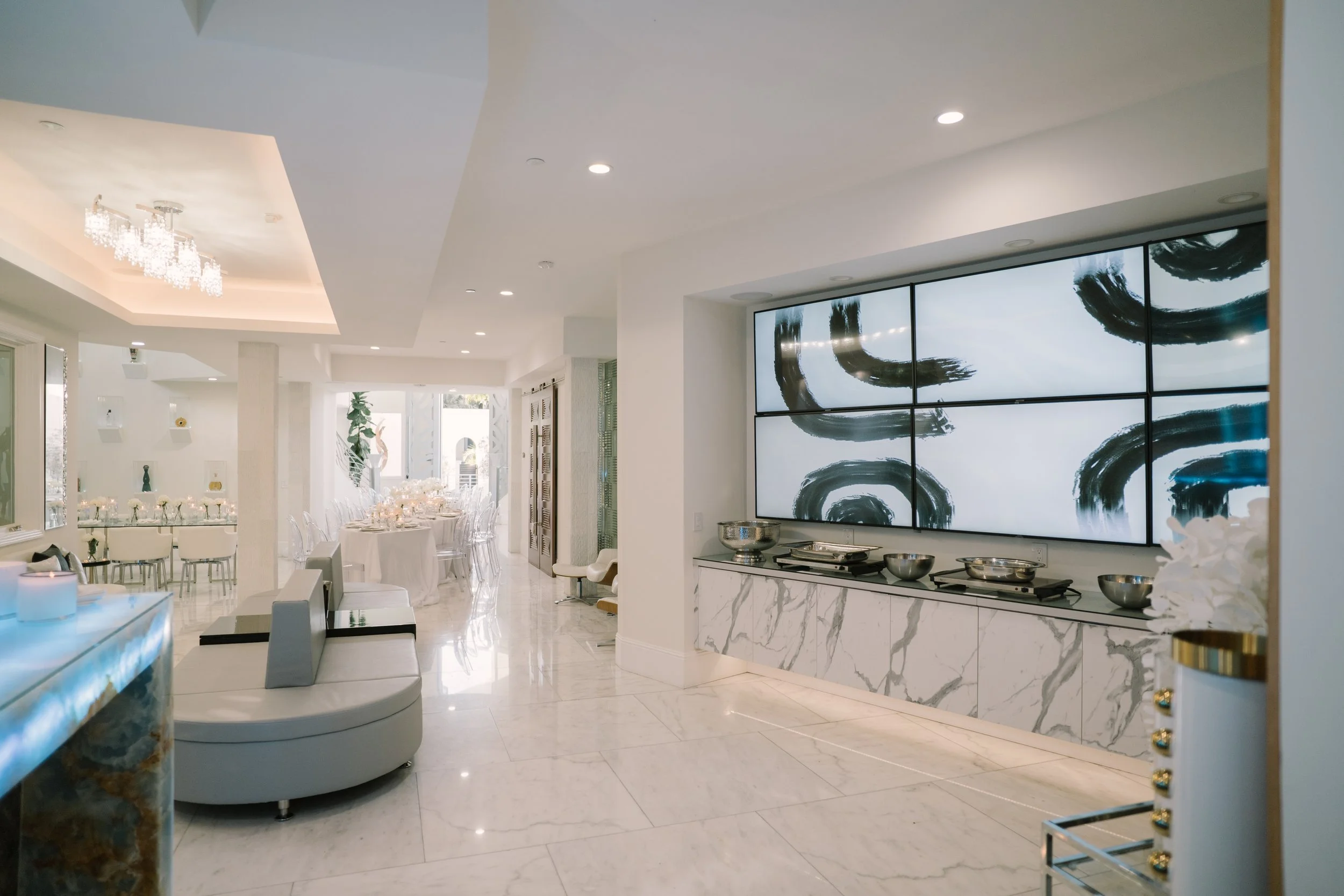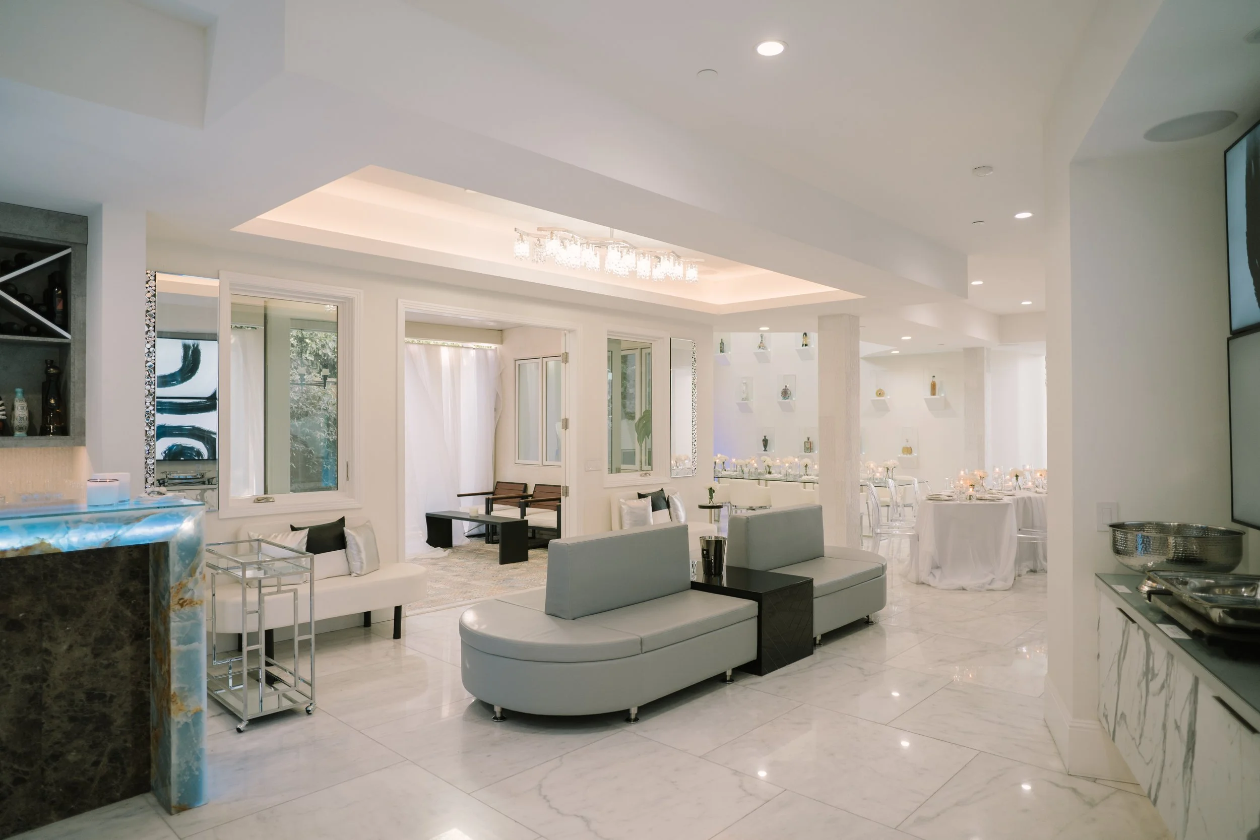 The interior boasts exquisite marble floors, providing a luxurious foundation throughout the common areas. The estate features expansive open-concept spaces, allowing for fluid movement and endless possibilities for event configurations. Each room transitions smoothly into the next, all while maintaining an elegant and cohesive design. Large windows invite natural light, and enhancing the estate's feel of tranquility and sophistication, complete with surround sound speakers and art on rotation via flatscreens throughout.