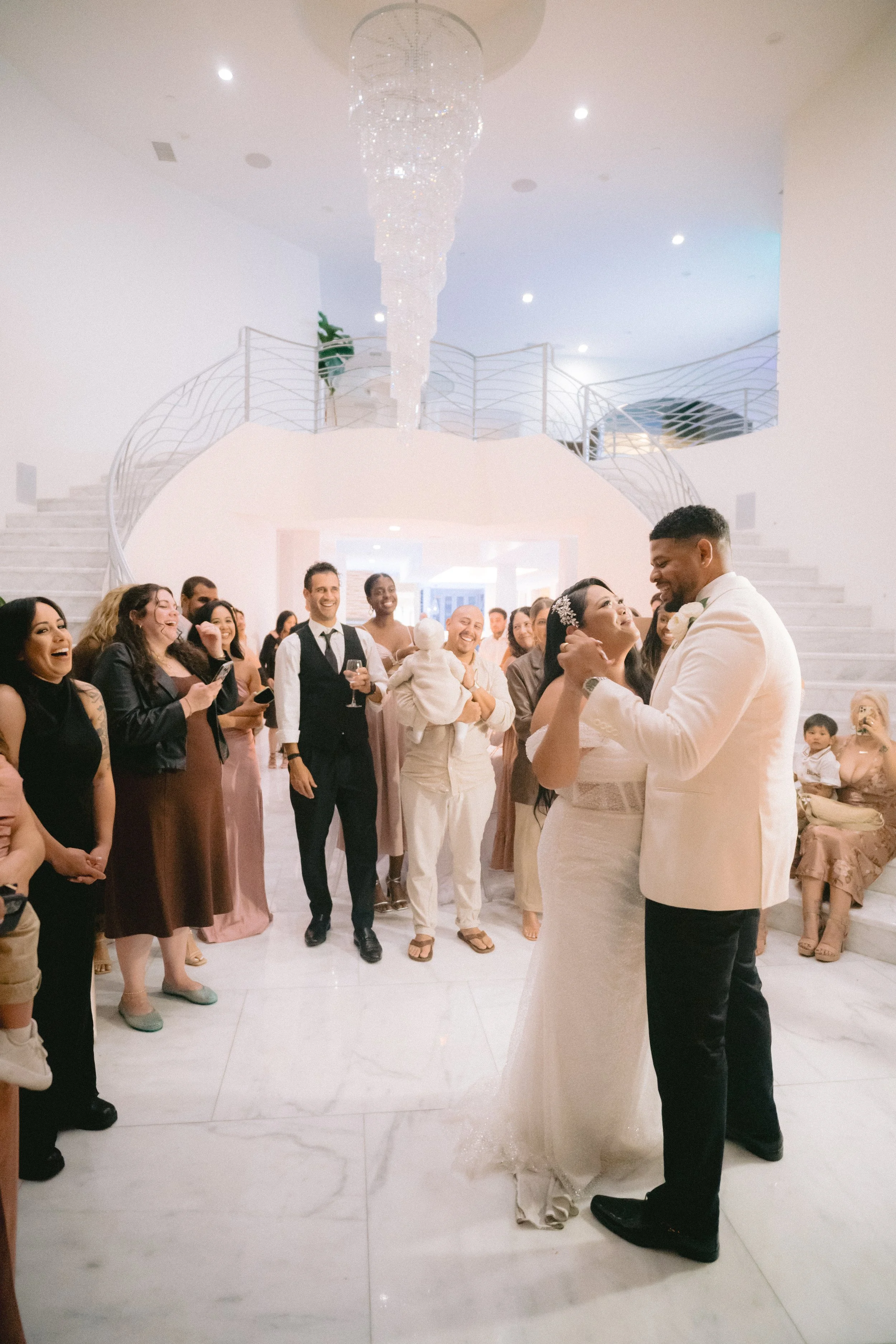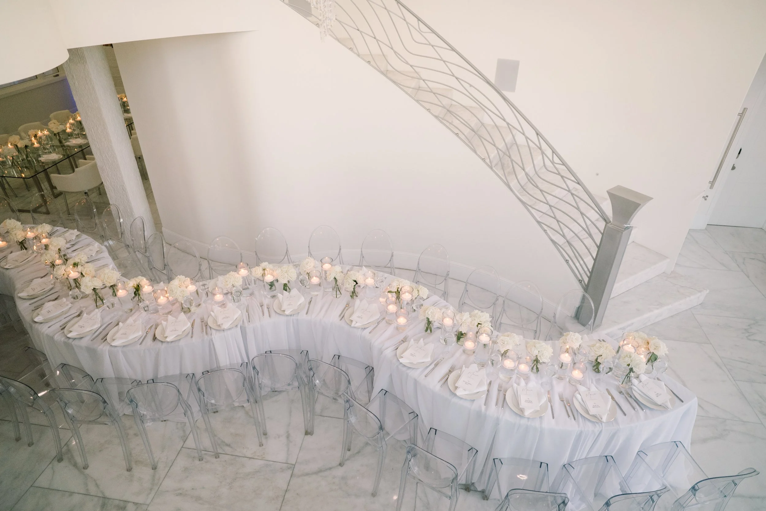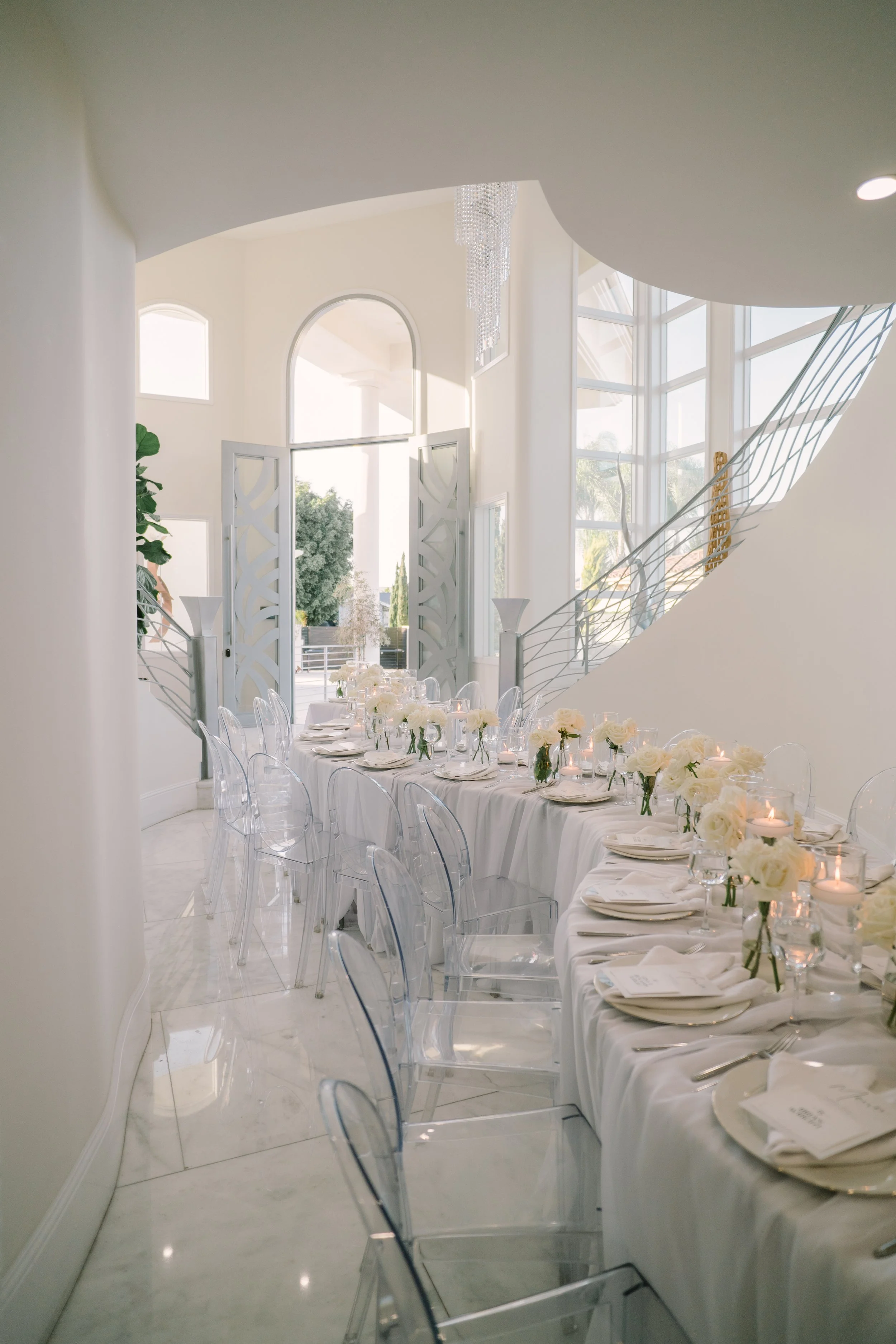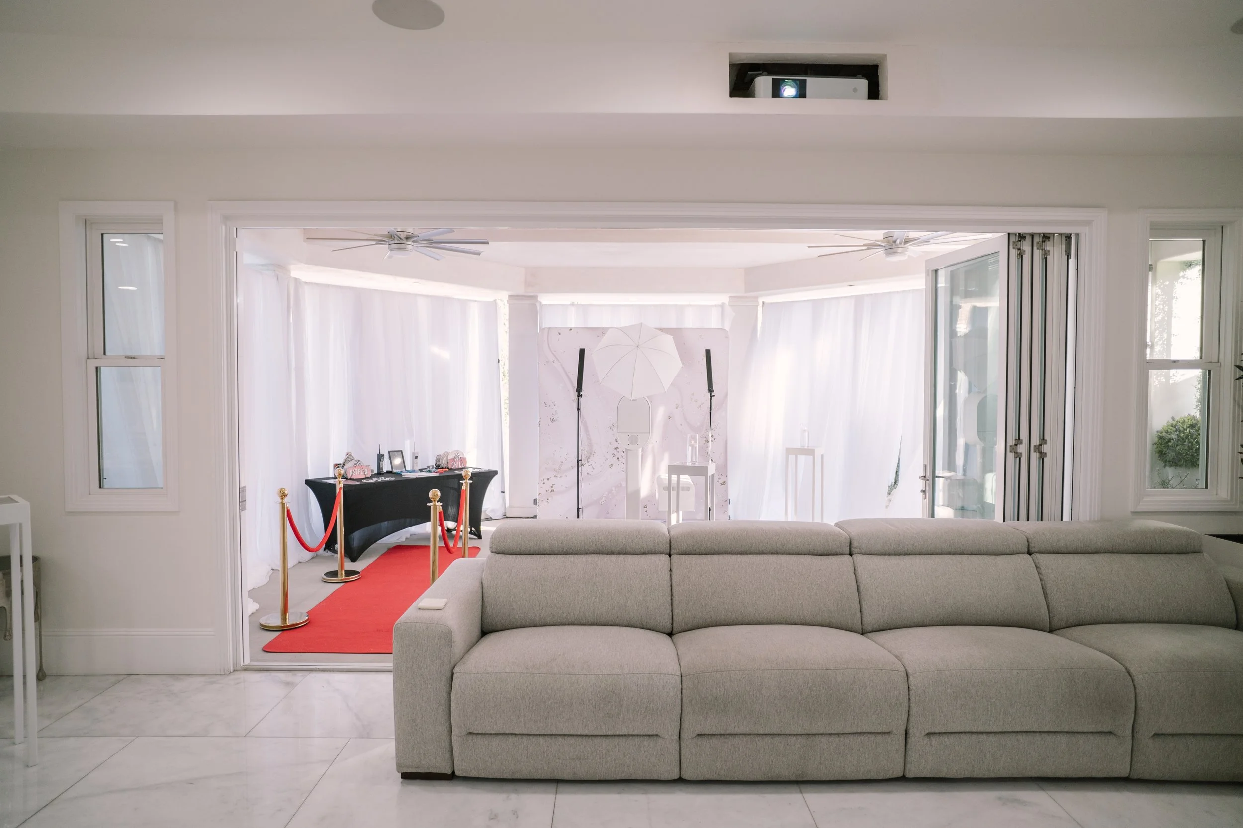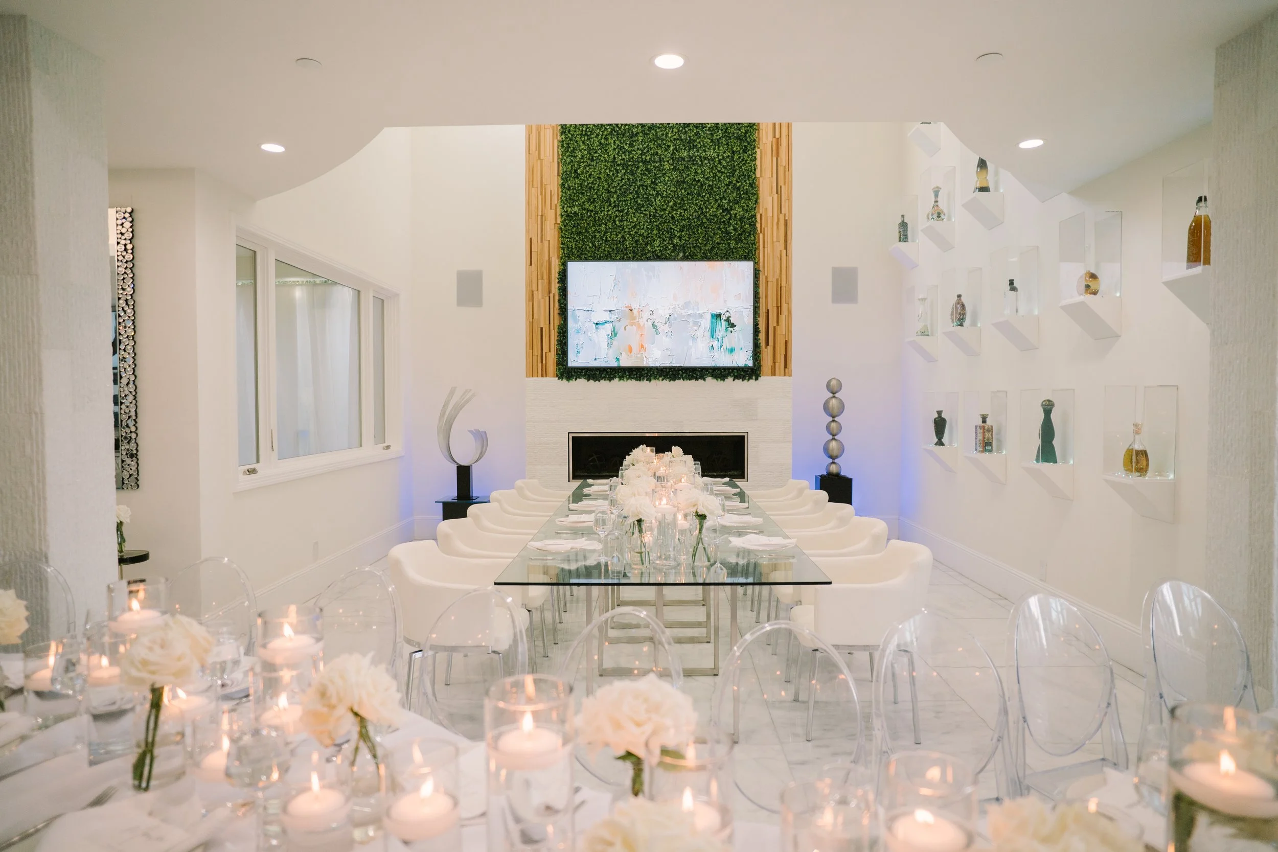 The interior boasts exquisite marble floors, providing a luxurious foundation throughout the common areas. The estate features expansive open-concept spaces, allowing for fluid movement and endless possibilities for event configurations. Each room transitions smoothly into the next, all while maintaining an elegant and cohesive design. Large windows invite natural light, and enhancing the estate's feel of tranquility and sophistication, complete with surround sound speakers and art on rotation via flatscreens throughout.