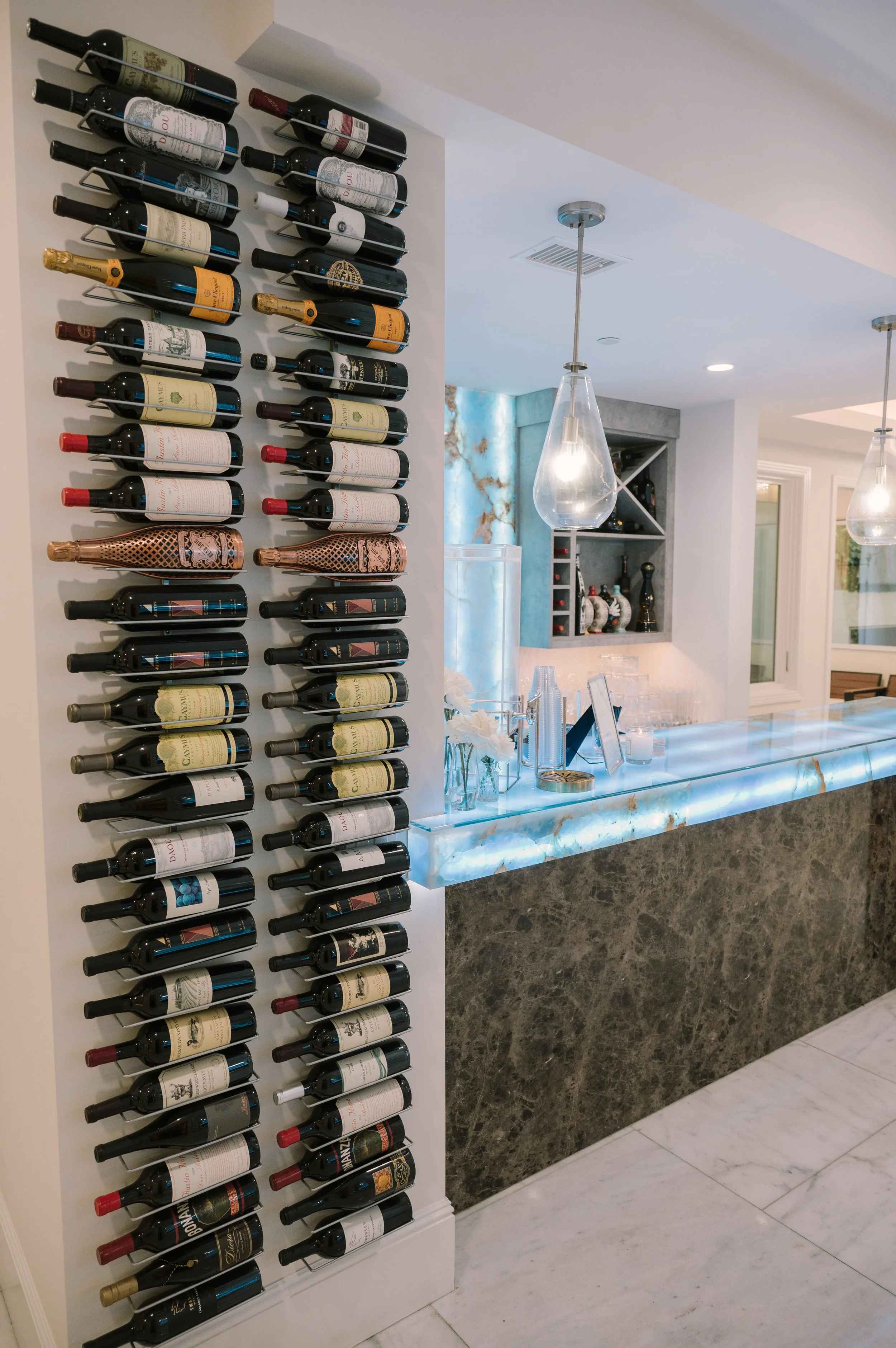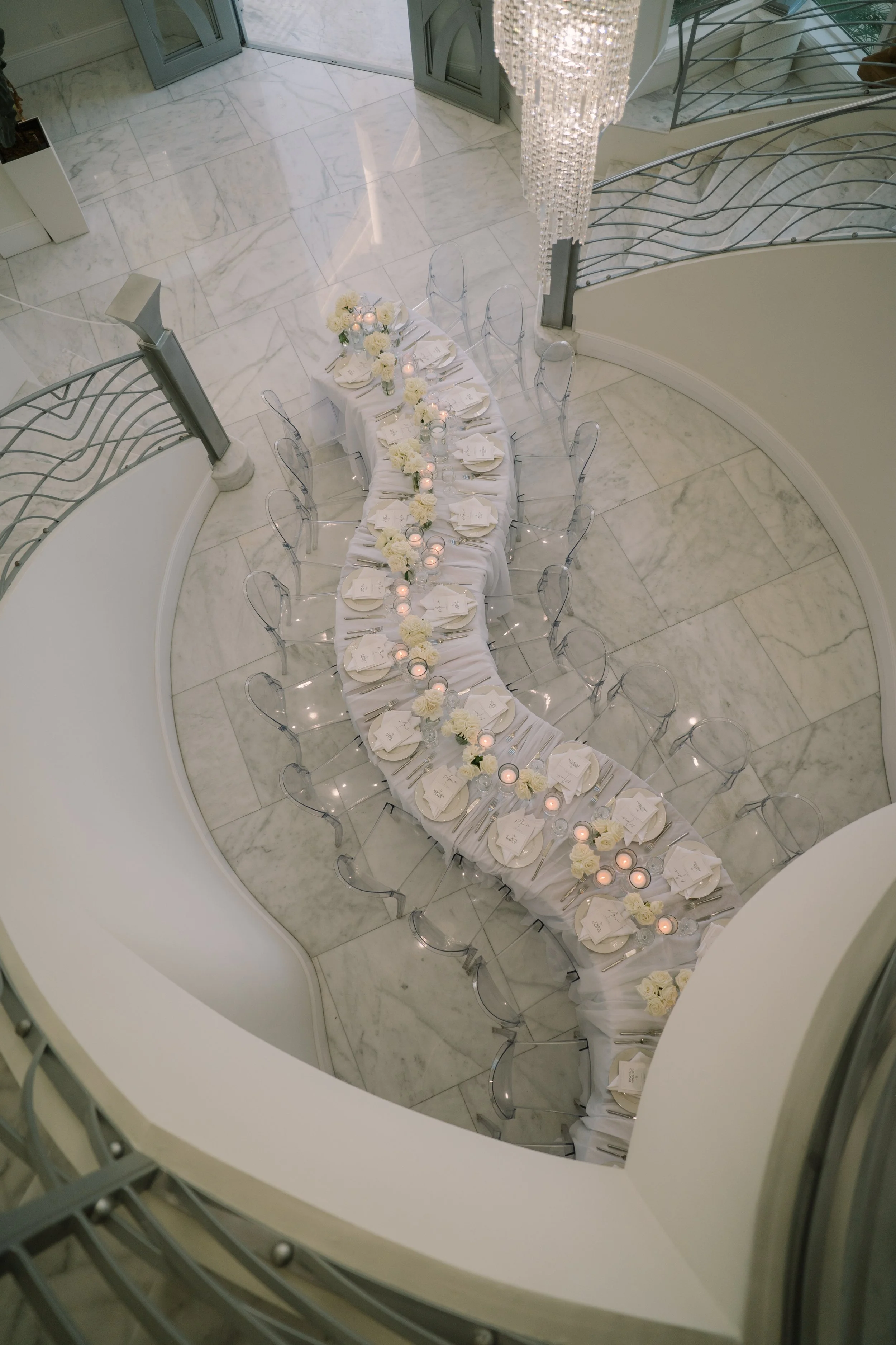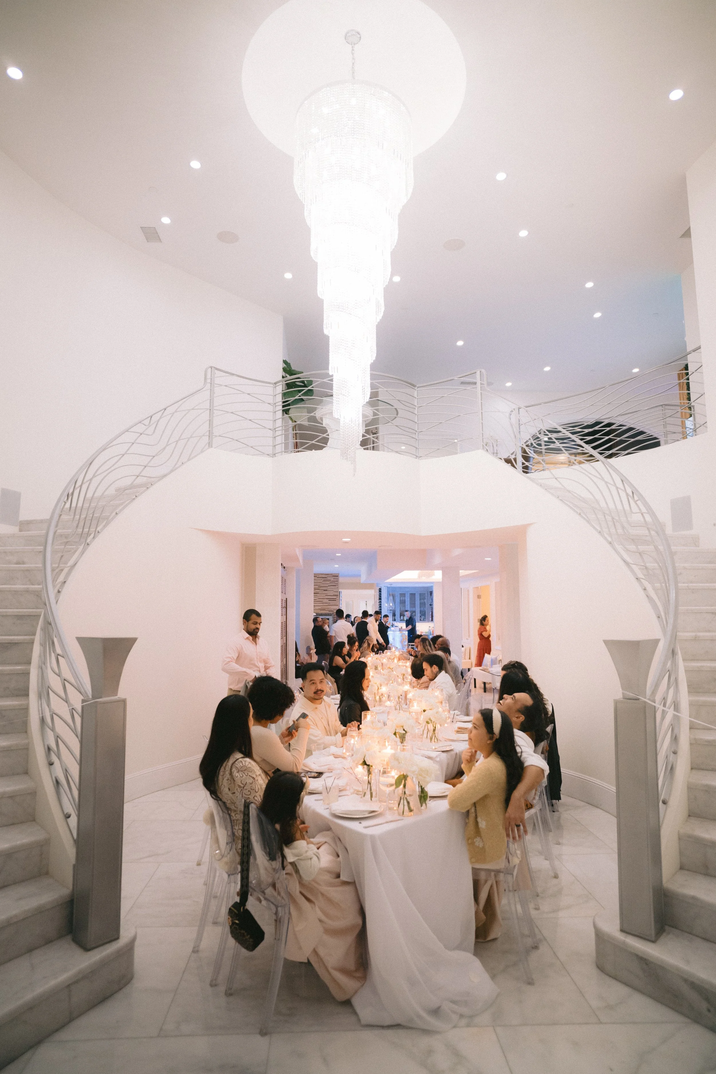 Illuminating the entryway is an impressive chandelier, cascading from above and serving as a stunning centerpiece. Its brilliance reflects off the marble, creating a warm and welcoming ambiance that sets the tone for gatherings.